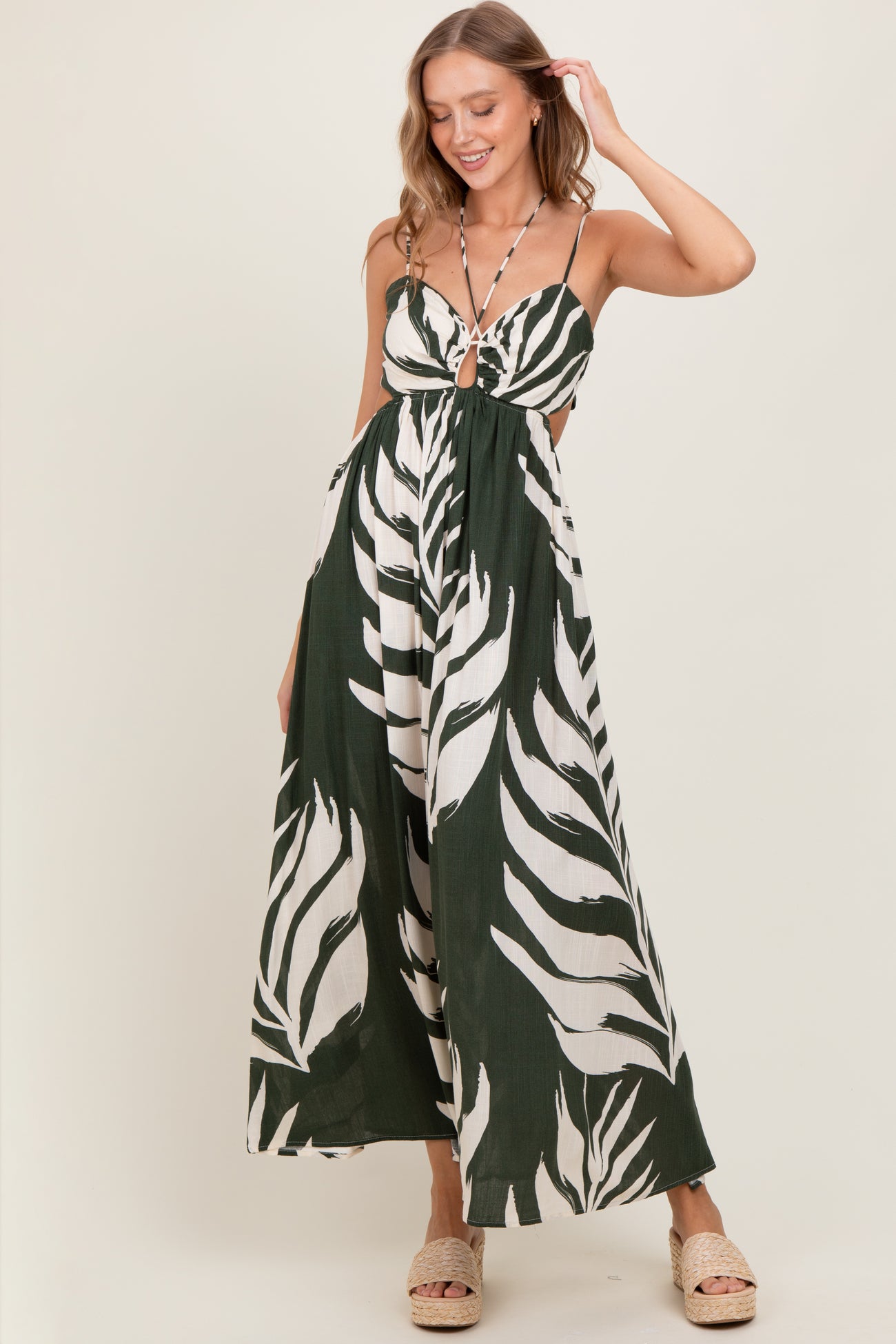 Olive Leaf Print Cutout Tie Back Maxi Dress