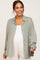 A solid basic button down blouse with a collared neckline, button closure in front and on sleeves, and rounded hem.