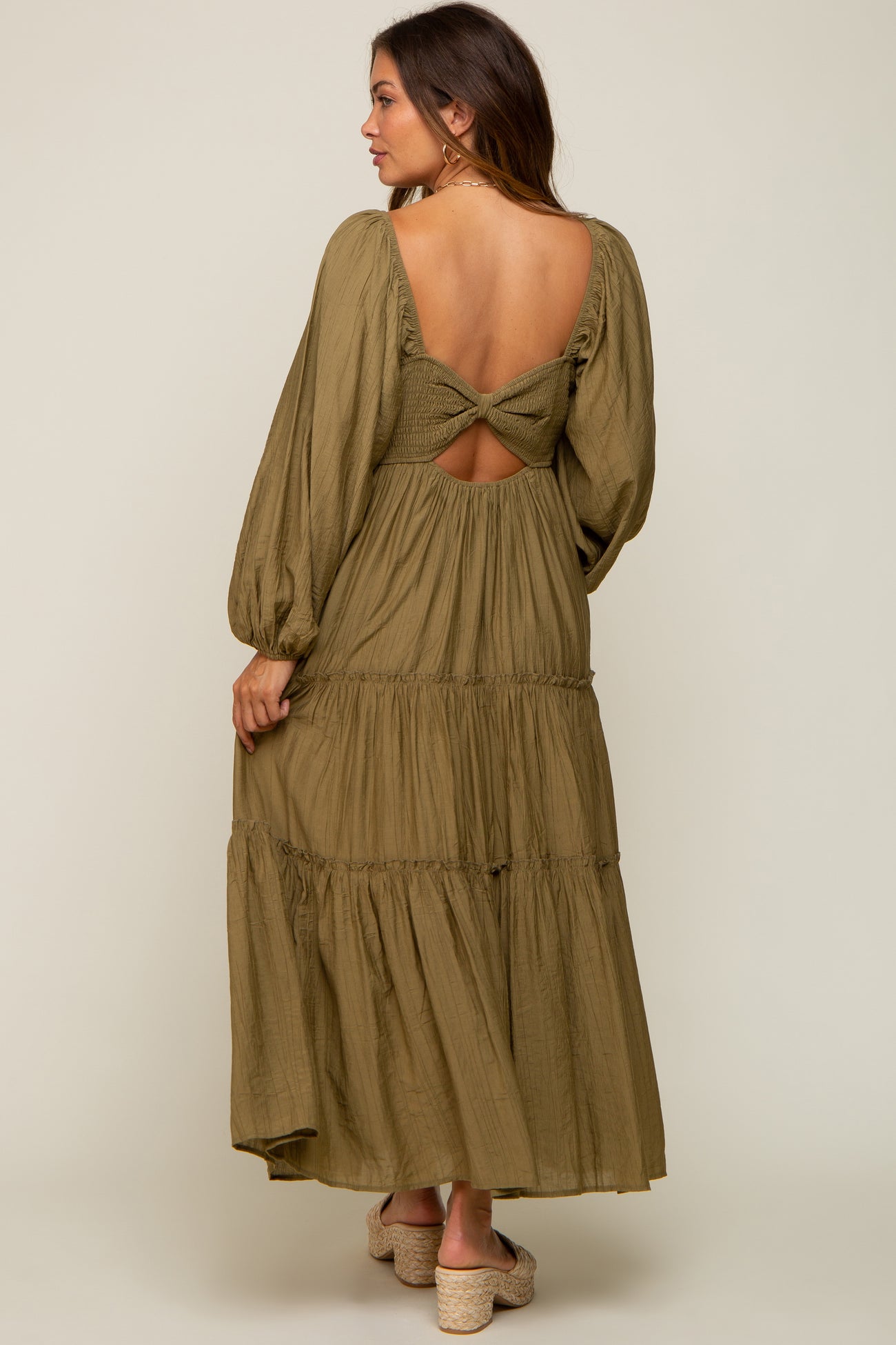 Olive Ruched Front Cutout Back Tiered Maternity Maxi Dress