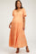 A solid maternity maxi dress with short sleeves, v-neckline, button detail on chest, and tiered skirt. Dress is double lined.