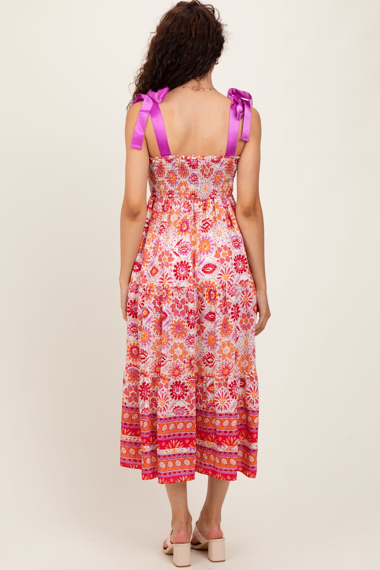 Orange Floral Shoulder Tie Smocked Midi Dress