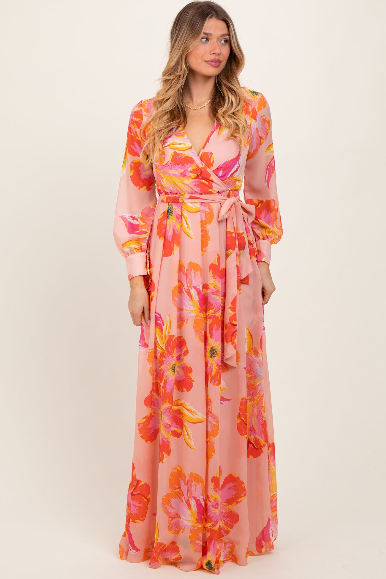 Peach Floral Chiffon Sash Tie Wrap Maxi Dress
