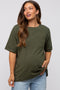 A solid maternity top featuring a front pocket, short sleeves, a v-neckline and side slits.