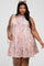 A sleeveless printed plus dress in a tiered body with a high ruffle neckline with tie back. Dress is partially lined.