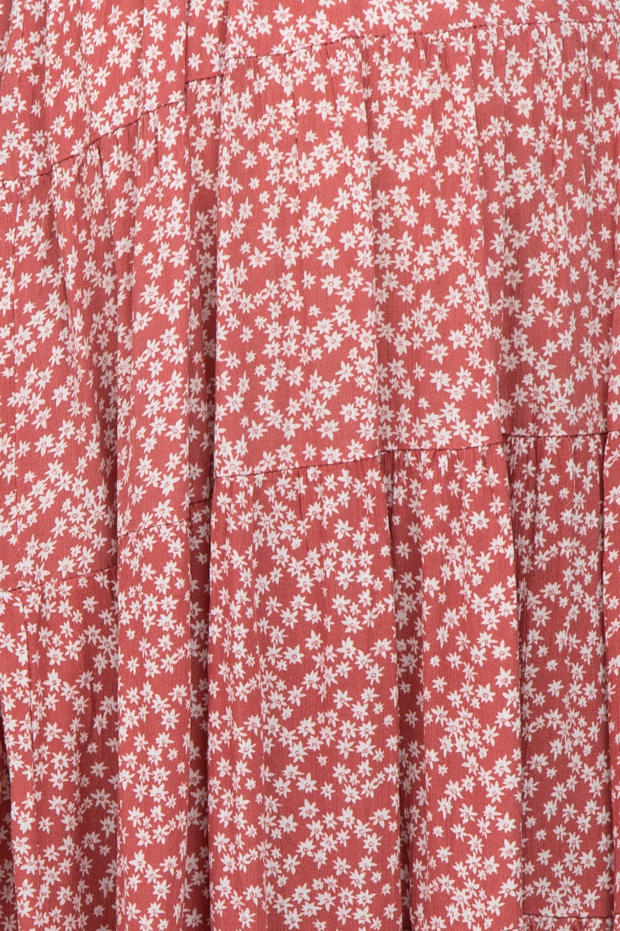A floral print maternity midi dress featuring a v-neckline, short bubble sleeves with ruffle trim, an empire waist with an elastic band, pleated tiers and a ruffle hem.