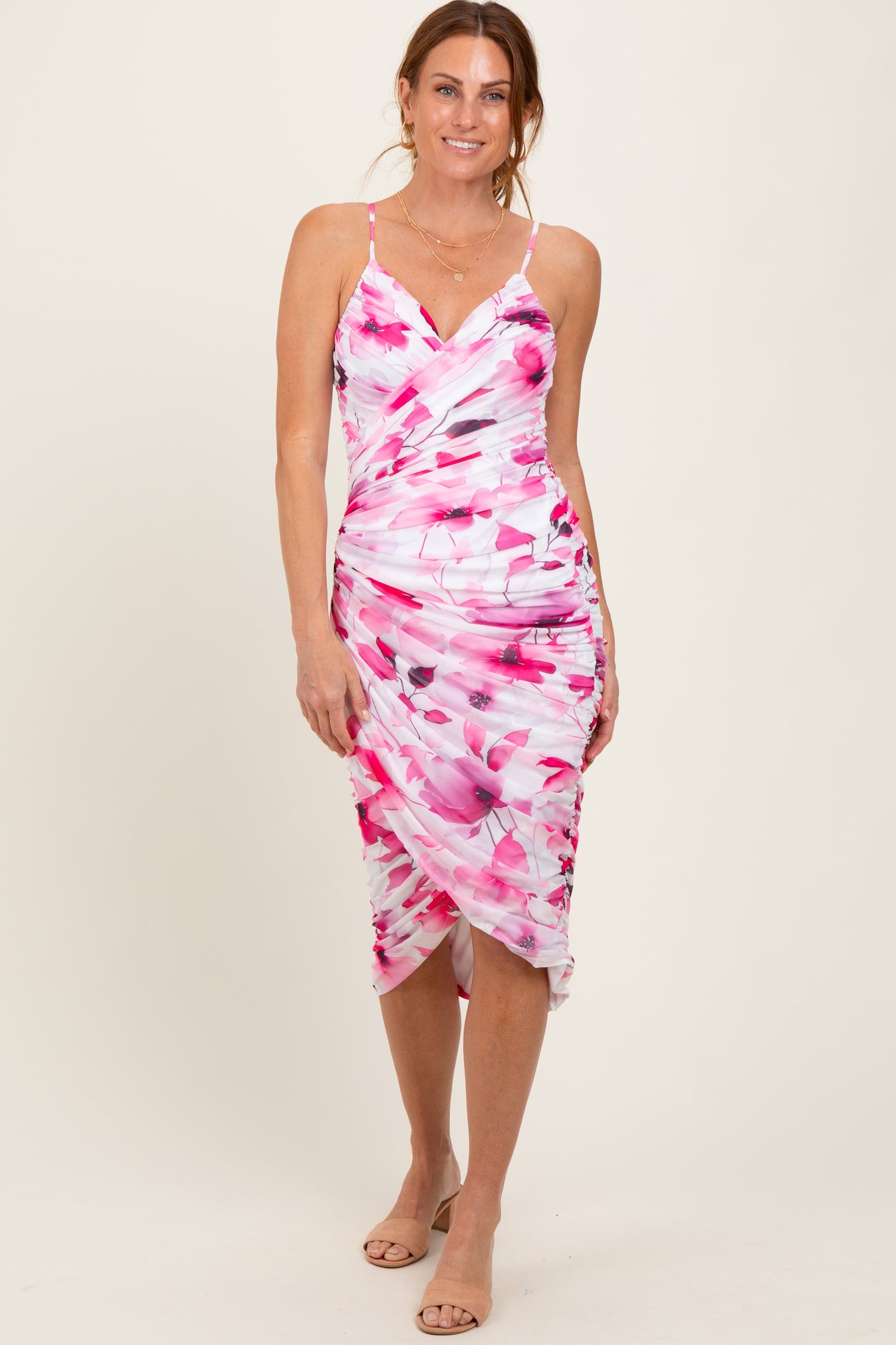 Pink Floral Ruched Tulip Hem Maternity Midi Dress