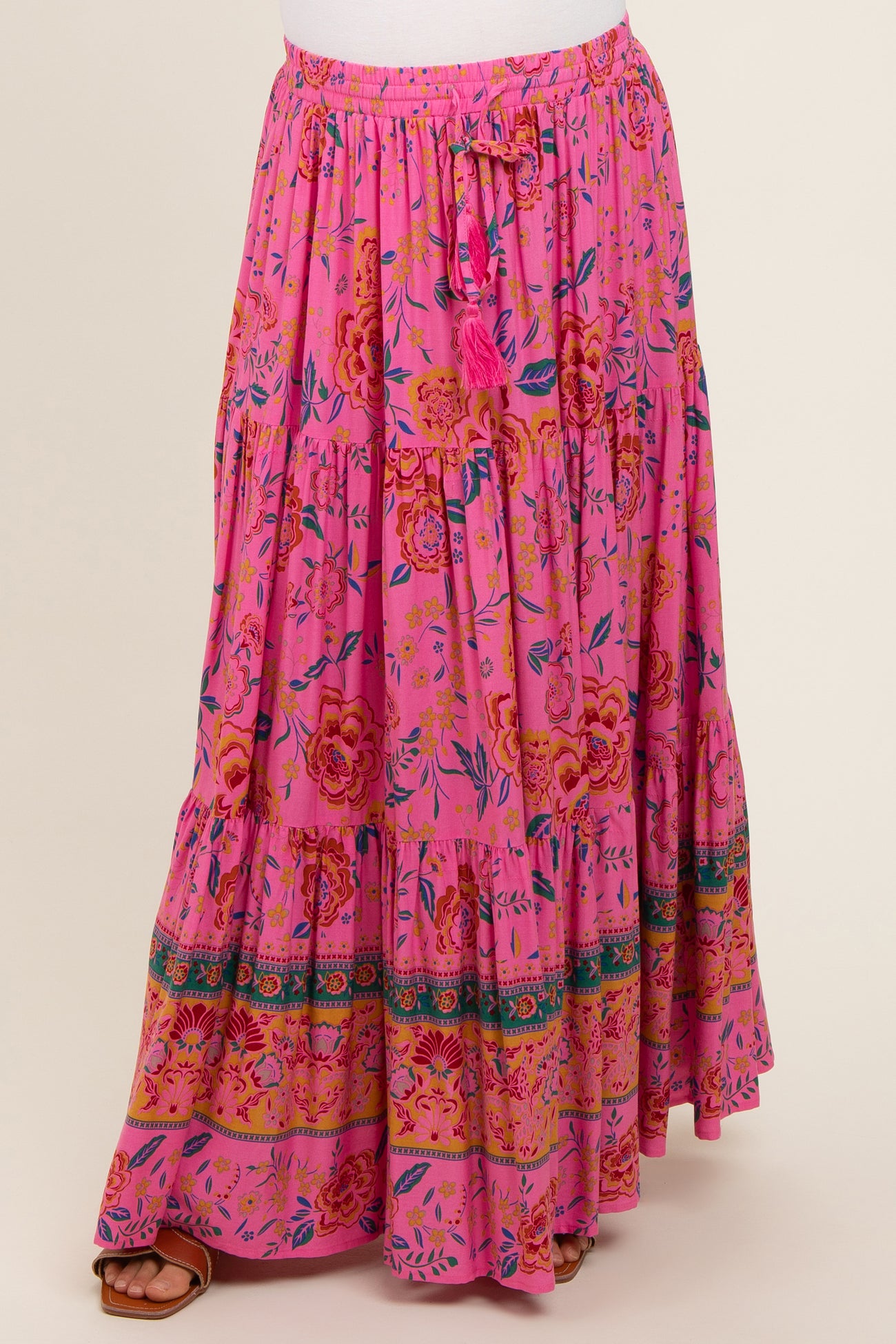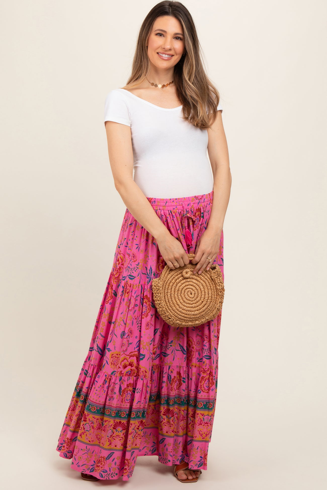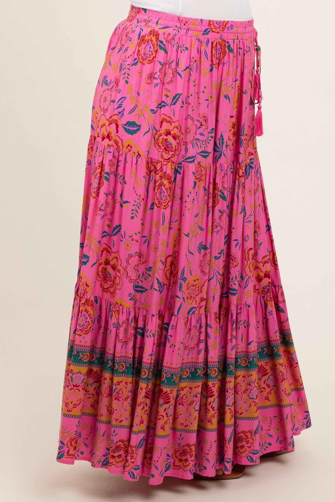 A floral print, tiered maternity maxi skirt featuring a self tie tassel waist.