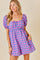 A printed romper with puff sleeves, square neckline with keyhole and tie detail and smocking in back. Romper is partially lined. Pocketed.