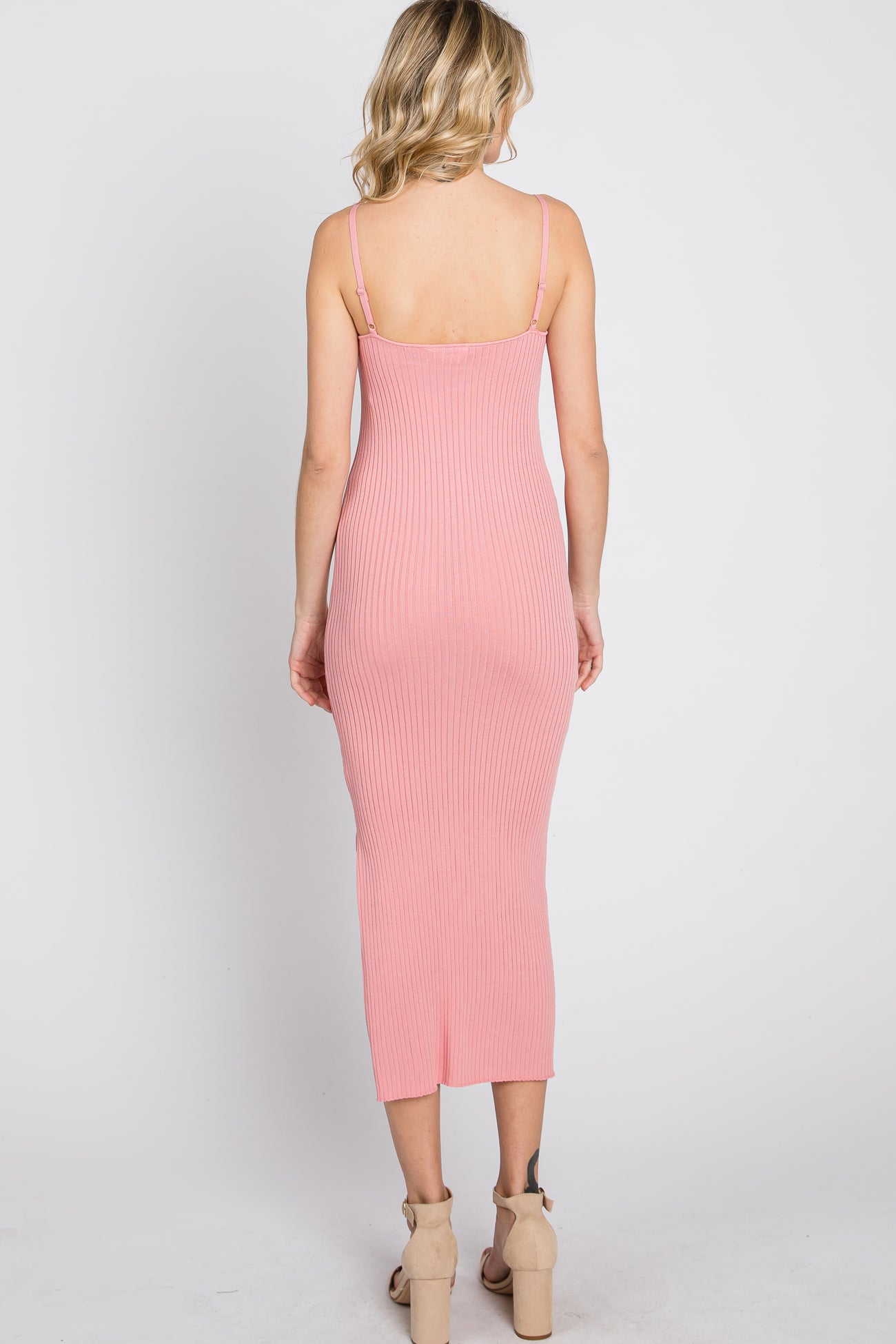 Pink Ribbed Square Neck Side Slit Midi Dress