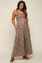 A watercolor print maternity midi dress featuring a squared neckline, ruffle straps, a smocked back, a ruffle accent at the waist, and a ruffle accent bottom tier. Skirt is lined 3/4 of the way down.