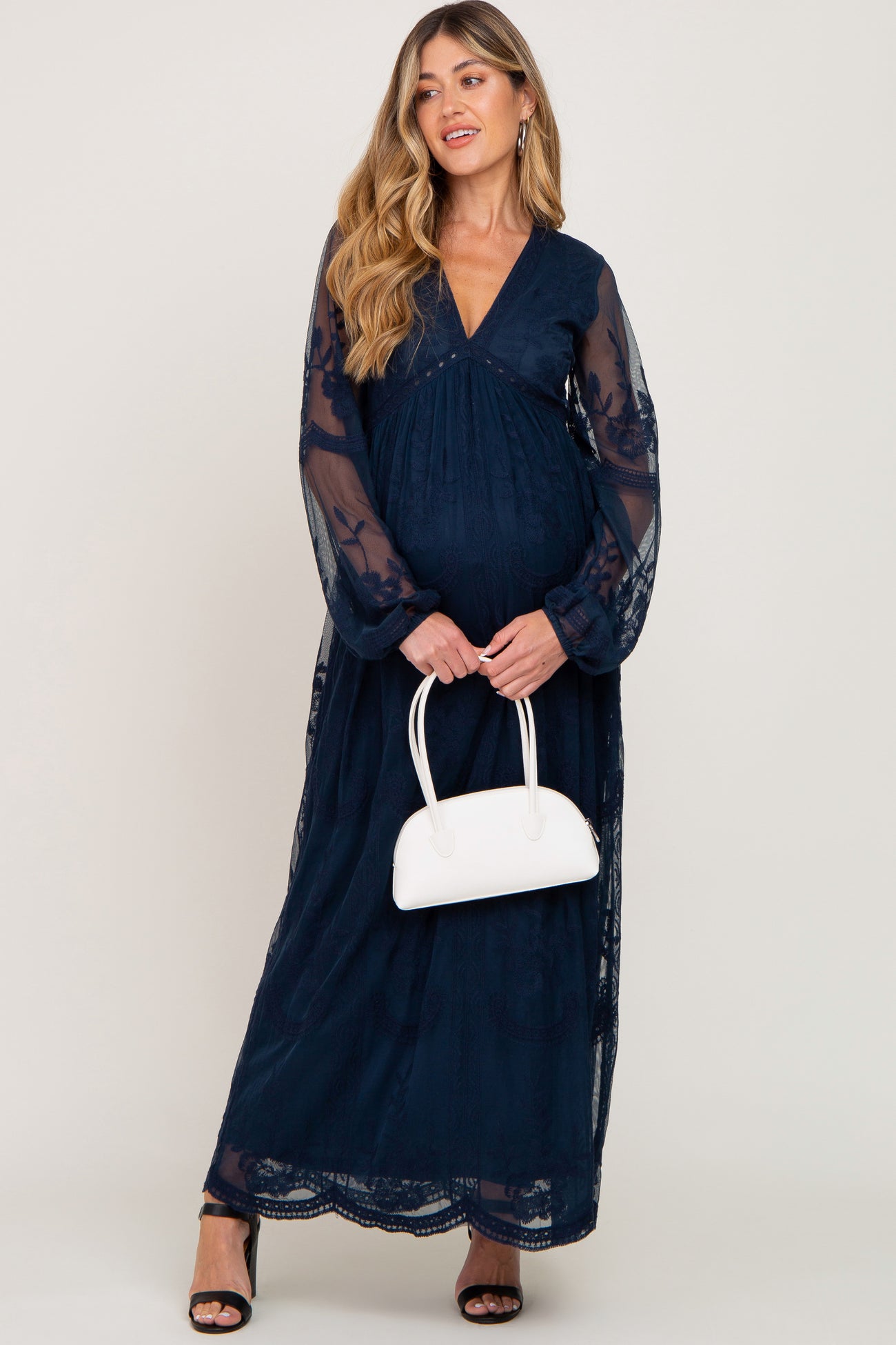 PinkBlush Navy Lace Mesh Overlay Long Sleeve Maternity Maxi Dress