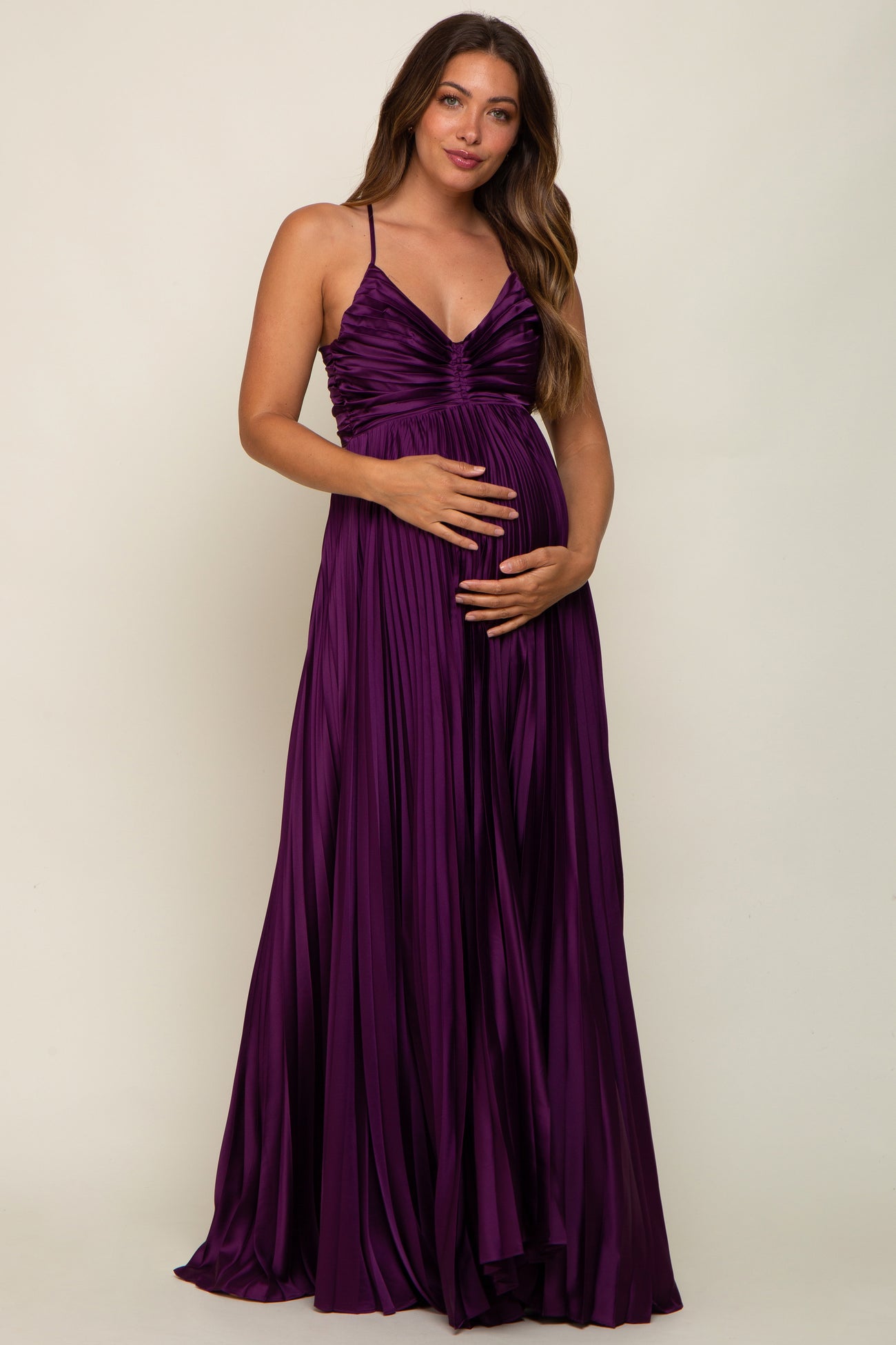 Details A solid maternity maxi gown in a satin pleated material. Features adjustable straps with crisscross design in back with cutout and tie detail. Content + Care