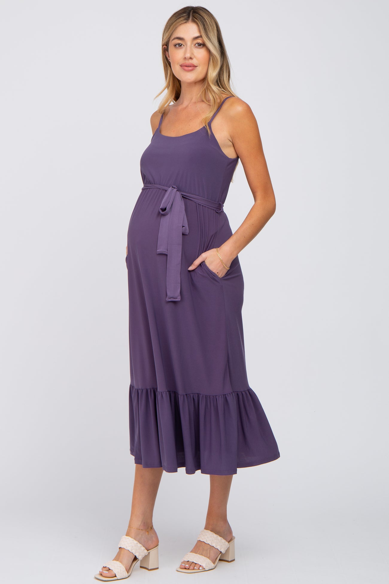 Purple Waist Tie Ruffle Hem Maternity Midi Dress