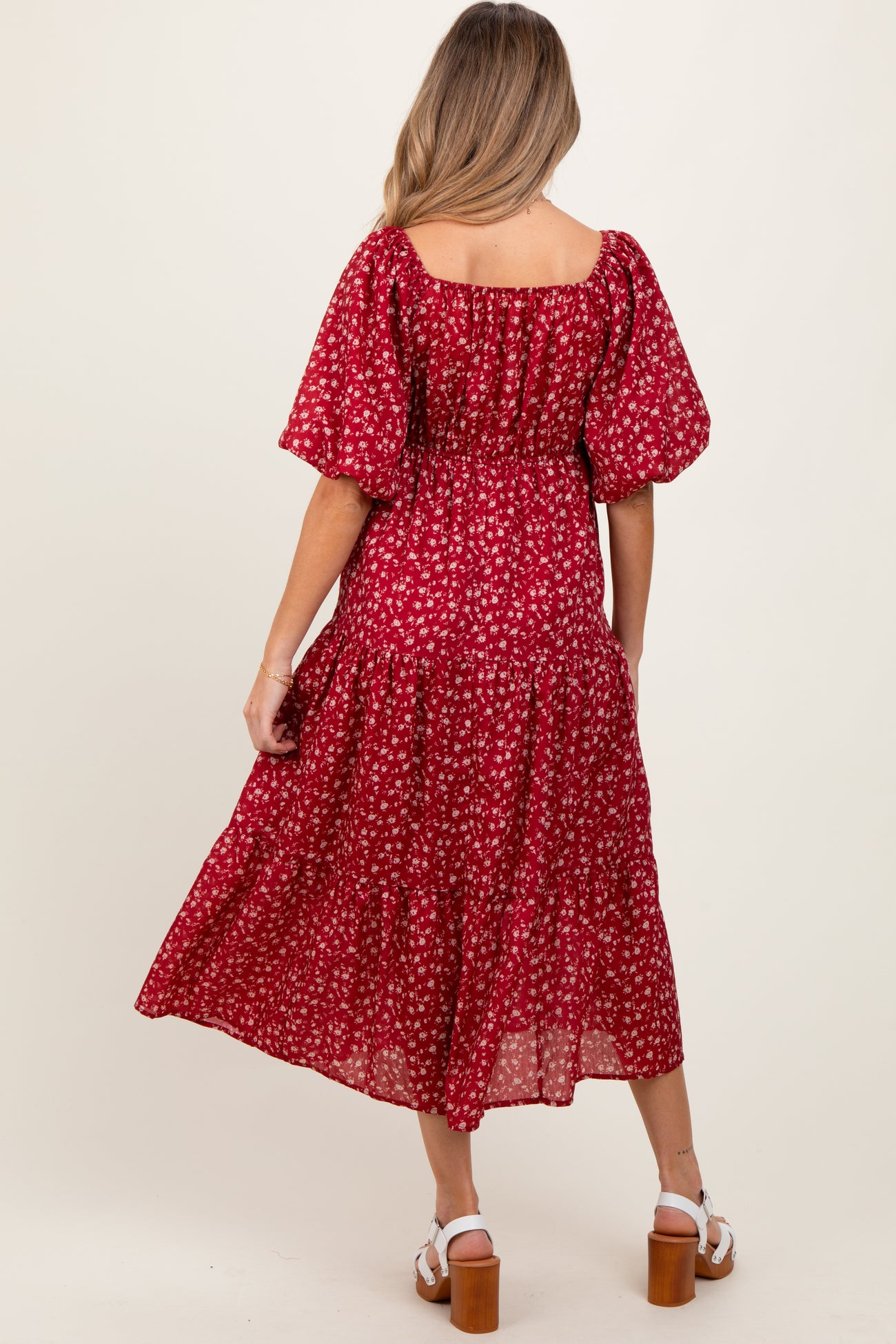 Red Floral Puff Sleeve Tiered Maternity Maxi Dress