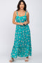 A striped midi dress featuring a square neckline, smocked elastic top, adjustable cami straps, and a ruffle hem.
