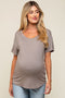 A solid hued maternity dress featuring short sleeves, a round neckline, side pockets, a curved hem and large side slits.