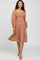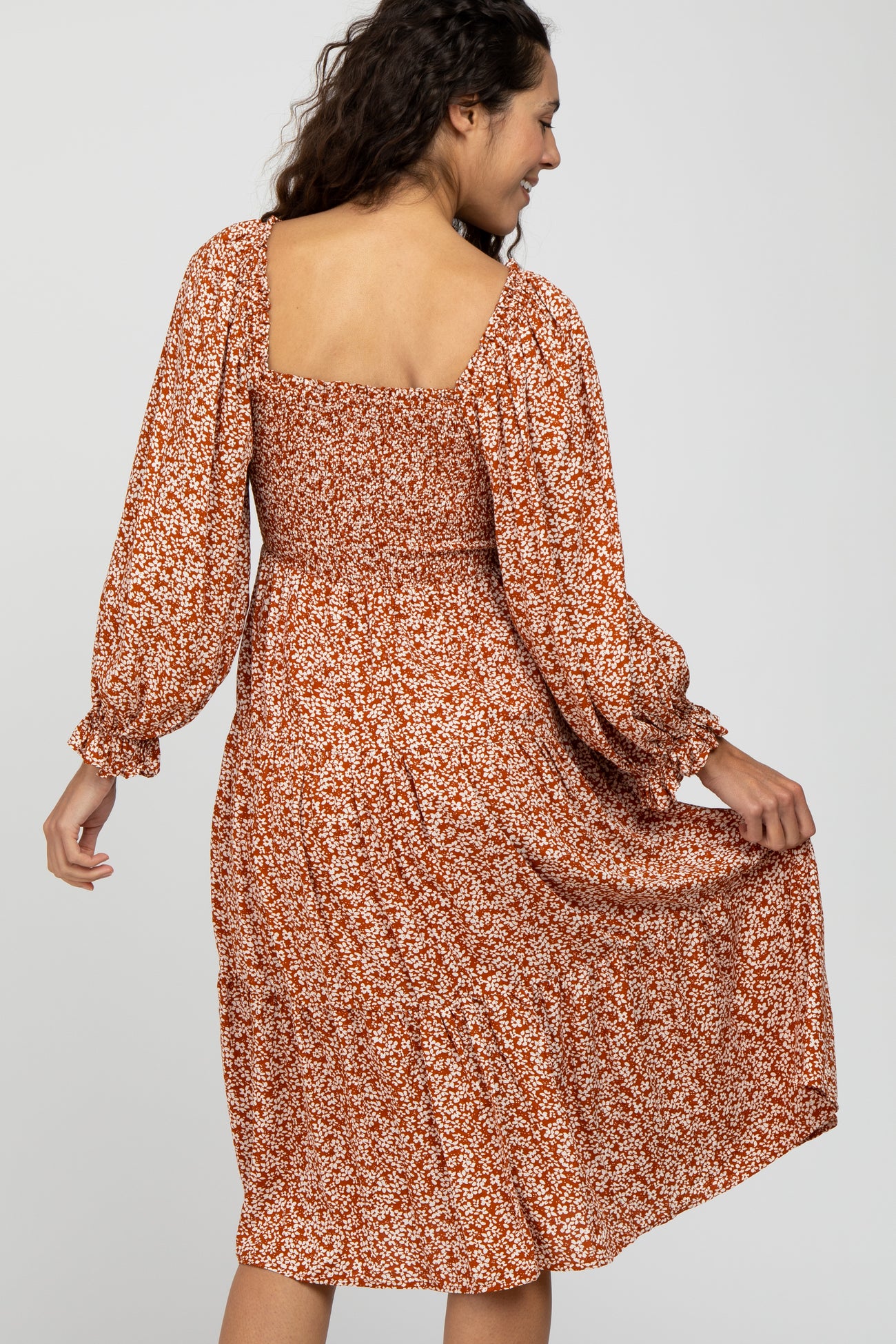 A floral print midi dress featuring a smocked bust, long cinched sleeves, a tiered body, and a square neckline. Skirt is double lined.