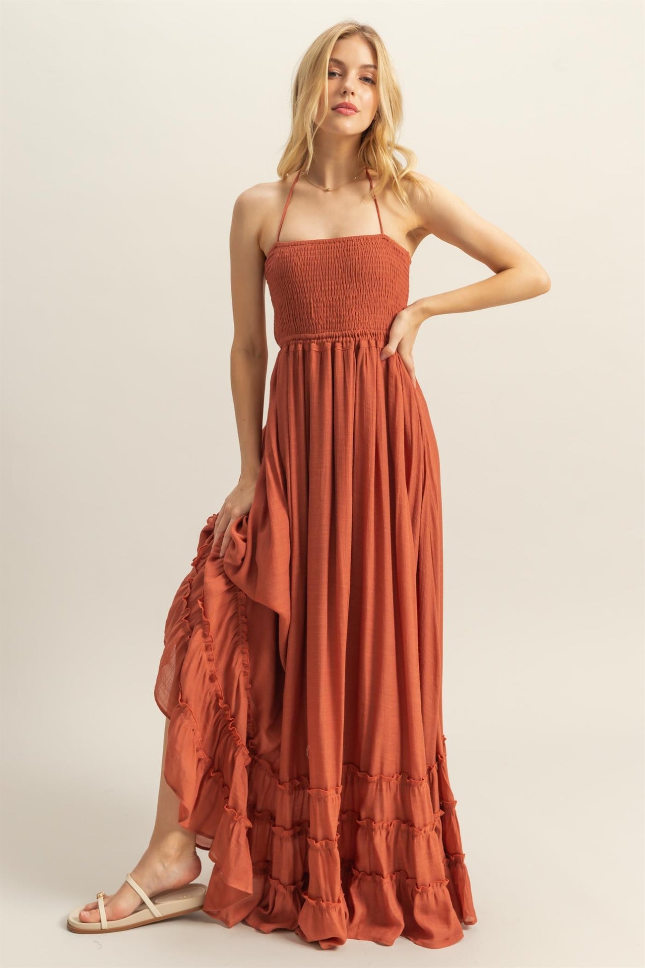 Rust Halter Neck Smocked Tiered Hem Maternity Maxi Dress