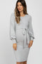 A pleated maternity midi dress with a sweetheart knot top, a front cutout, long sleeves, a back cutout with a back tie, and a lettuce hem.