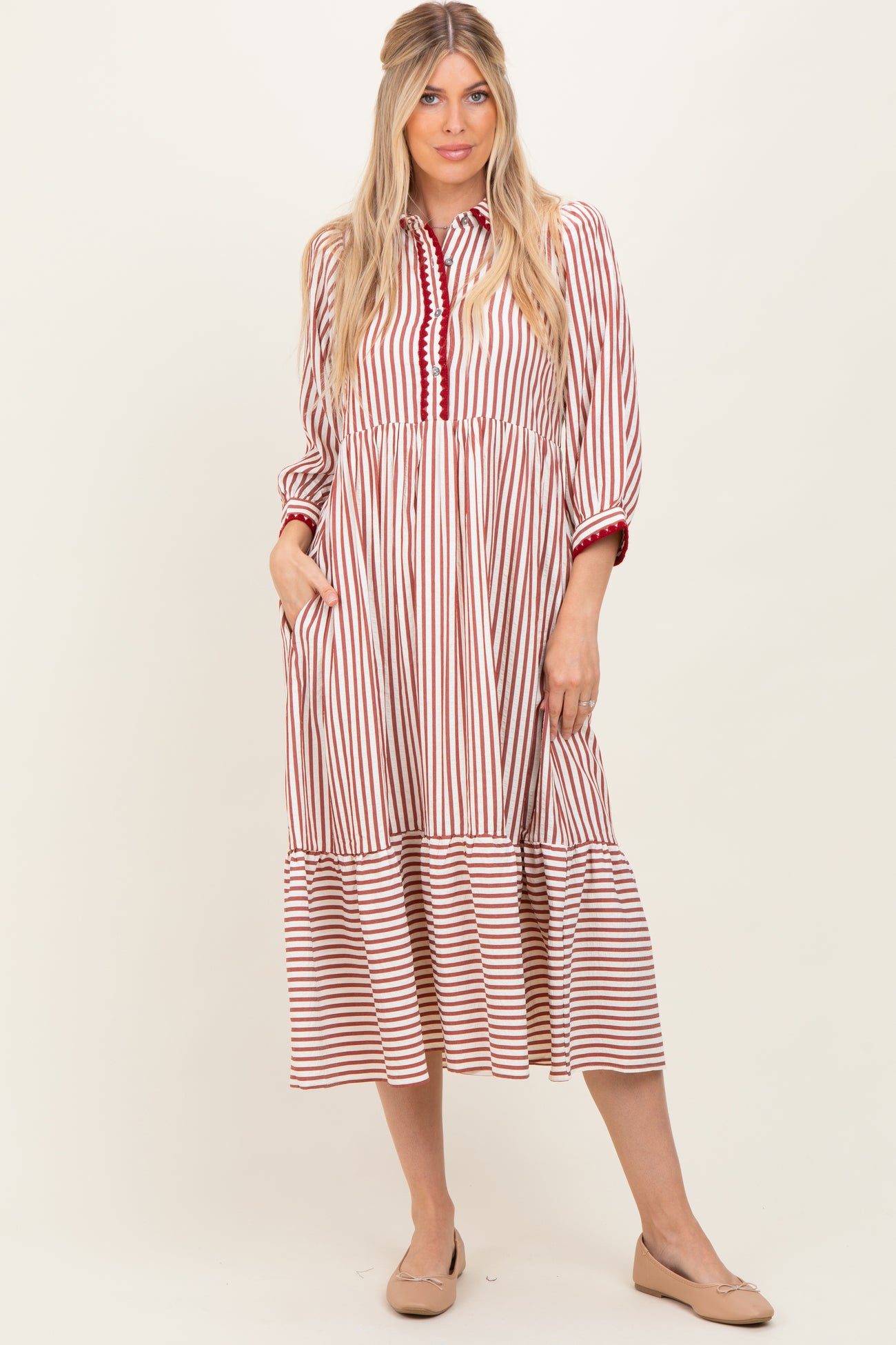 Elevate your maternity wardrobe with this Rust Striped Scallop Trim Midi Dress, designed for comfort and style. Featuring soft, breathable fabric with vertical rust stripes, this dress gently flatters your growing bump. The 3/4 sleeves and scallop trim detail along the collar, cuffs, and button placket add a charming, feminine touch. Its flowing silhouette and tiered hem create effortless movement and grace. Perfect for casual outings or special occasions, pair it with boots or flats for a chic, on-the-go look. Embrace maternity fashion that feels as good as it looks!