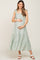 A printed maternity midi dress featuring bow tie straps, a shirred bust, a lined skirt, an elastic waist, and a tiered skirt. Straps are not adjustable.