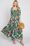 A solid dress featuring a collar, front functioning buttons, shirring at the waist, and side pockets.