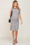 A solid maternity dress featuring a collar, front functioning buttons, shirring at the waist, and side pockets.