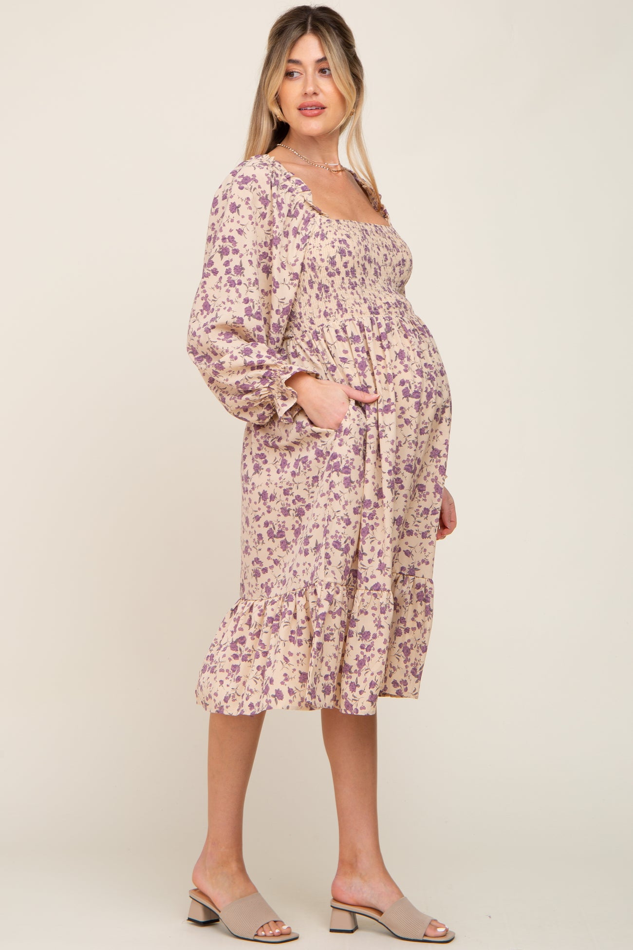 A floral maternity midi dress featuring long ruffle sleeves, a smocked top, side pockets, a ruffle hem and a square neckline.