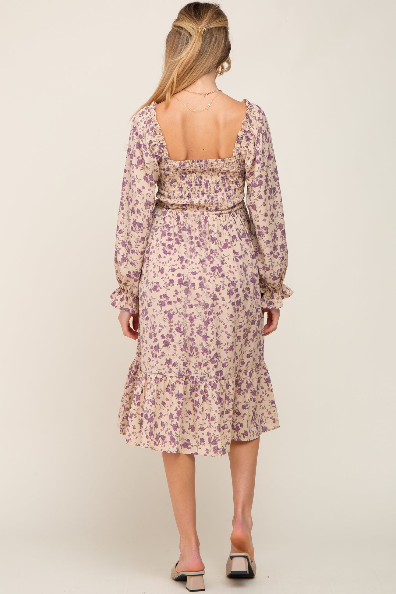 Taupe Floral Smocked Long Sleeve Maternity Midi Dress