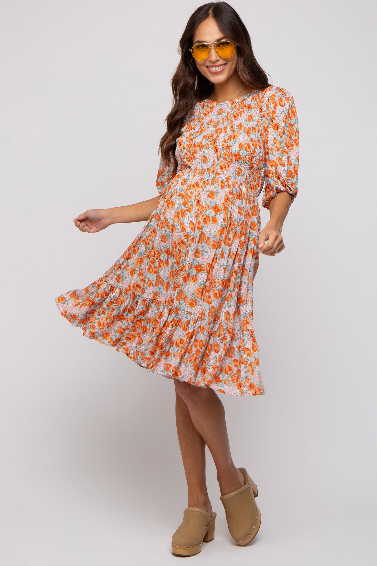 Taupe Floral Smocked Puff Sleeve Maternity Dress