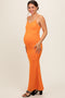 A sleeveless, ribbed maternity maxi dress with a scoop neckline and a side slit.