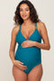 A soft knit maternity romper featuring a rounded v-neckline, a low v back, and a folded hem.