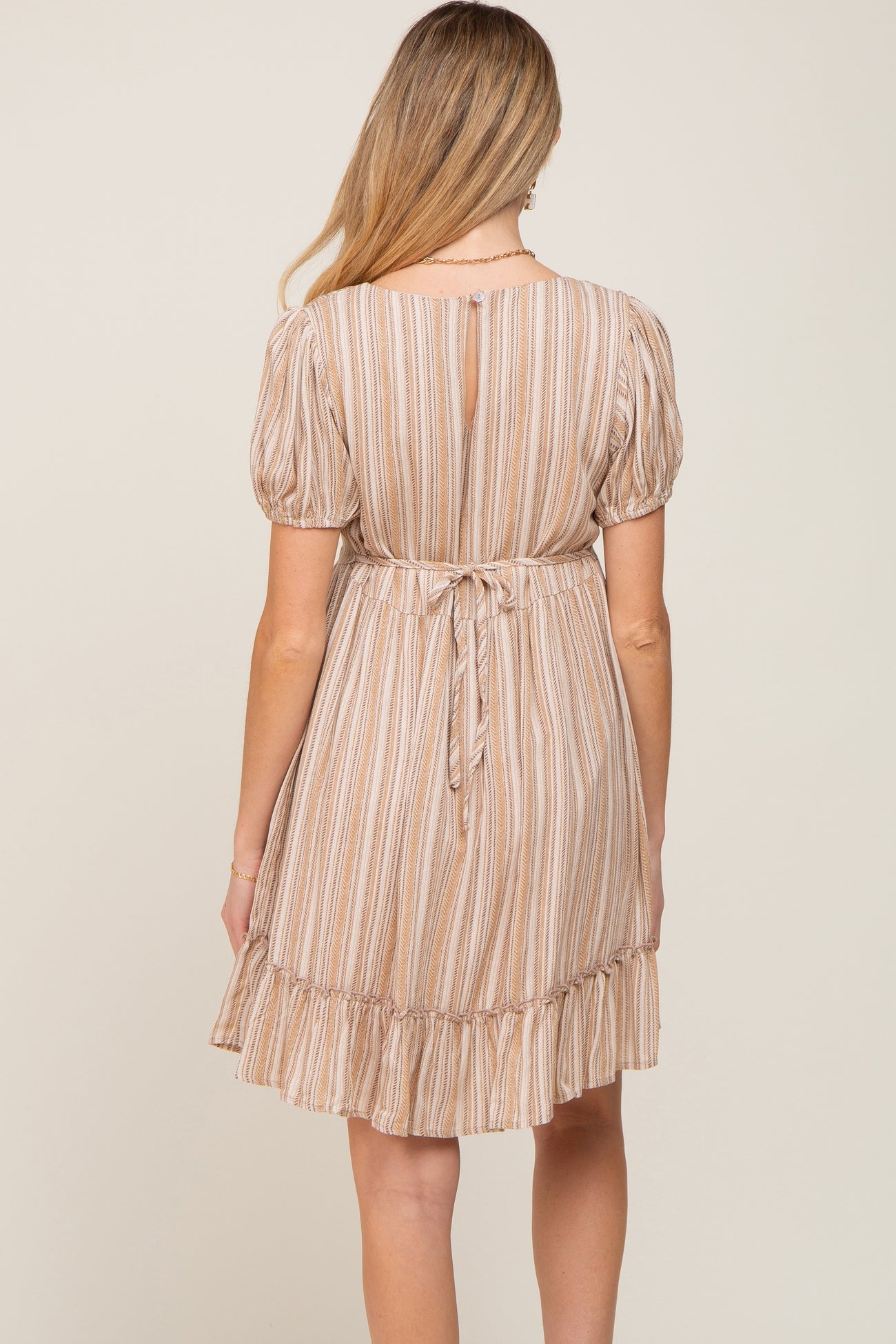 Taupe Stripe Print Puff Sleeve Maternity Dress