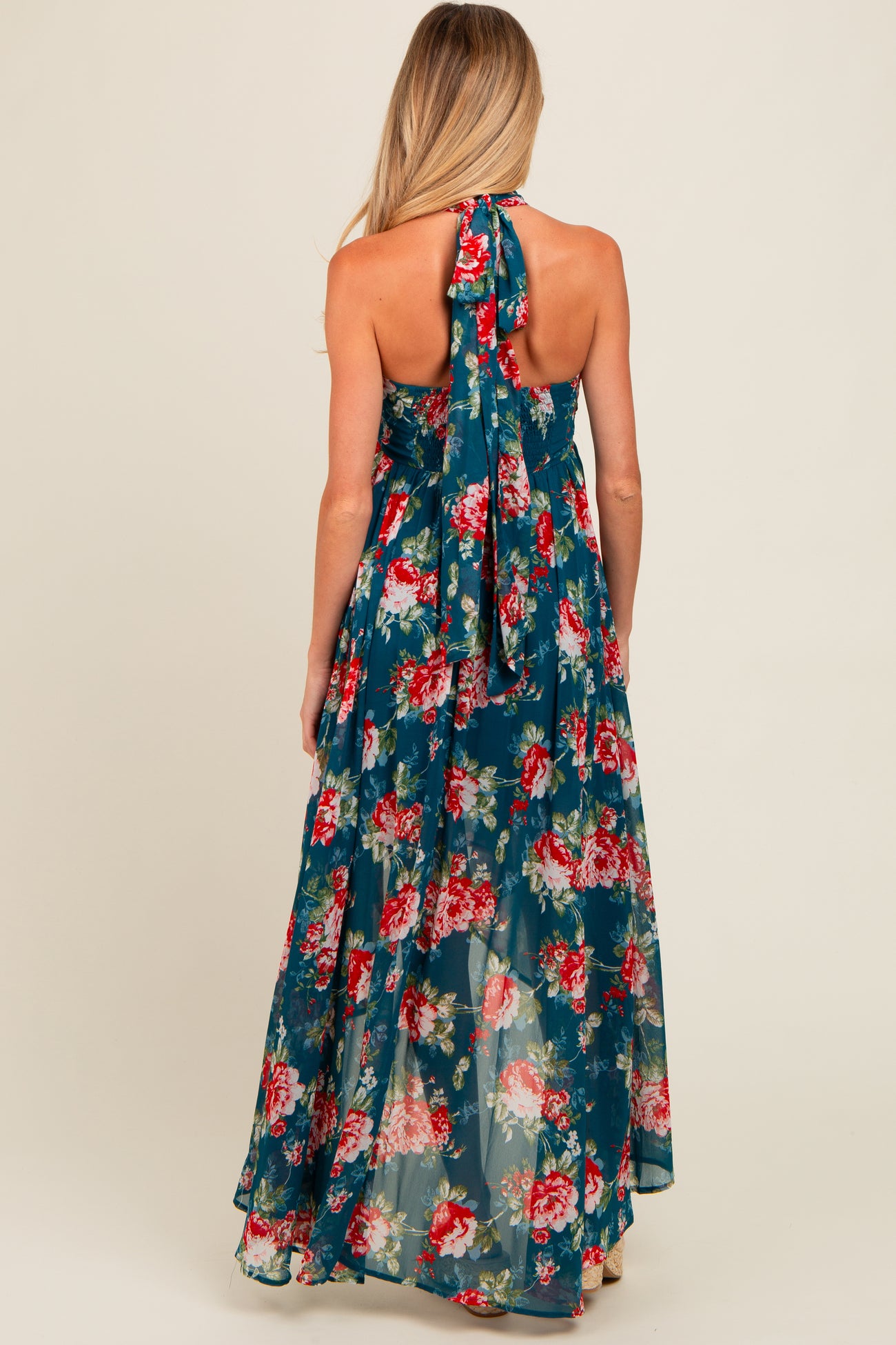 Teal Floral Halter Tie Back Hi-Lo Maternity Dress