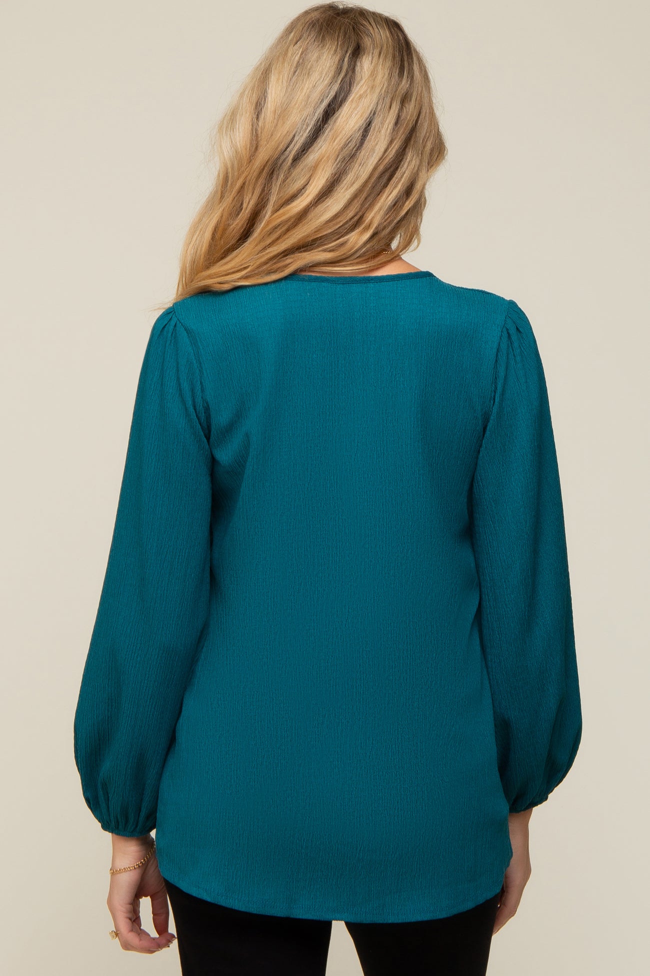 Details A solid textured maternity blouse featuring long sleeves and a v-neckline. Content + Care