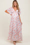 A smocked floral print midi dress featuring short sleeves and a square neckline.