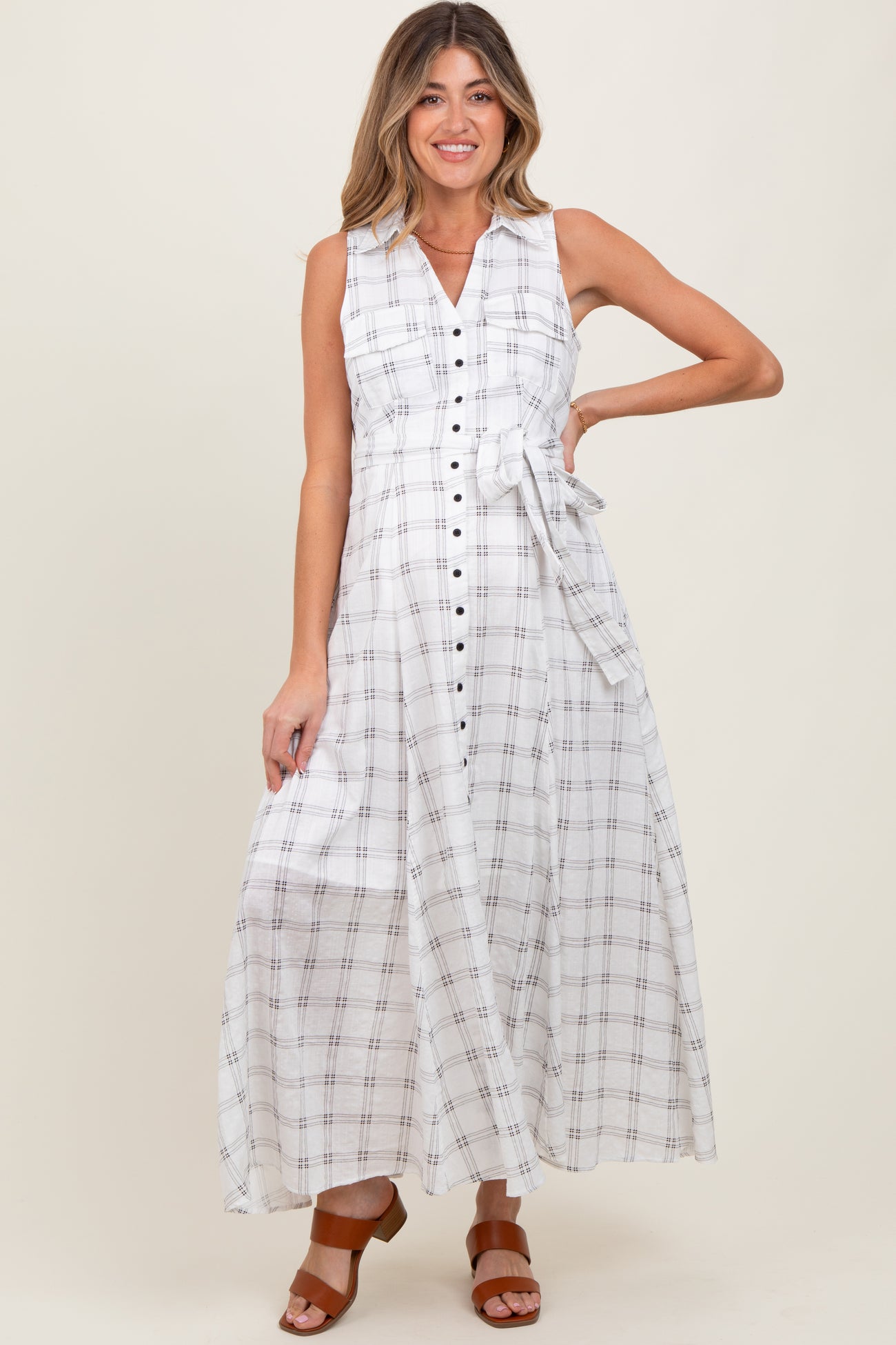 White Plaid Sleeveless Sash Tie Maternity Shirt Dress