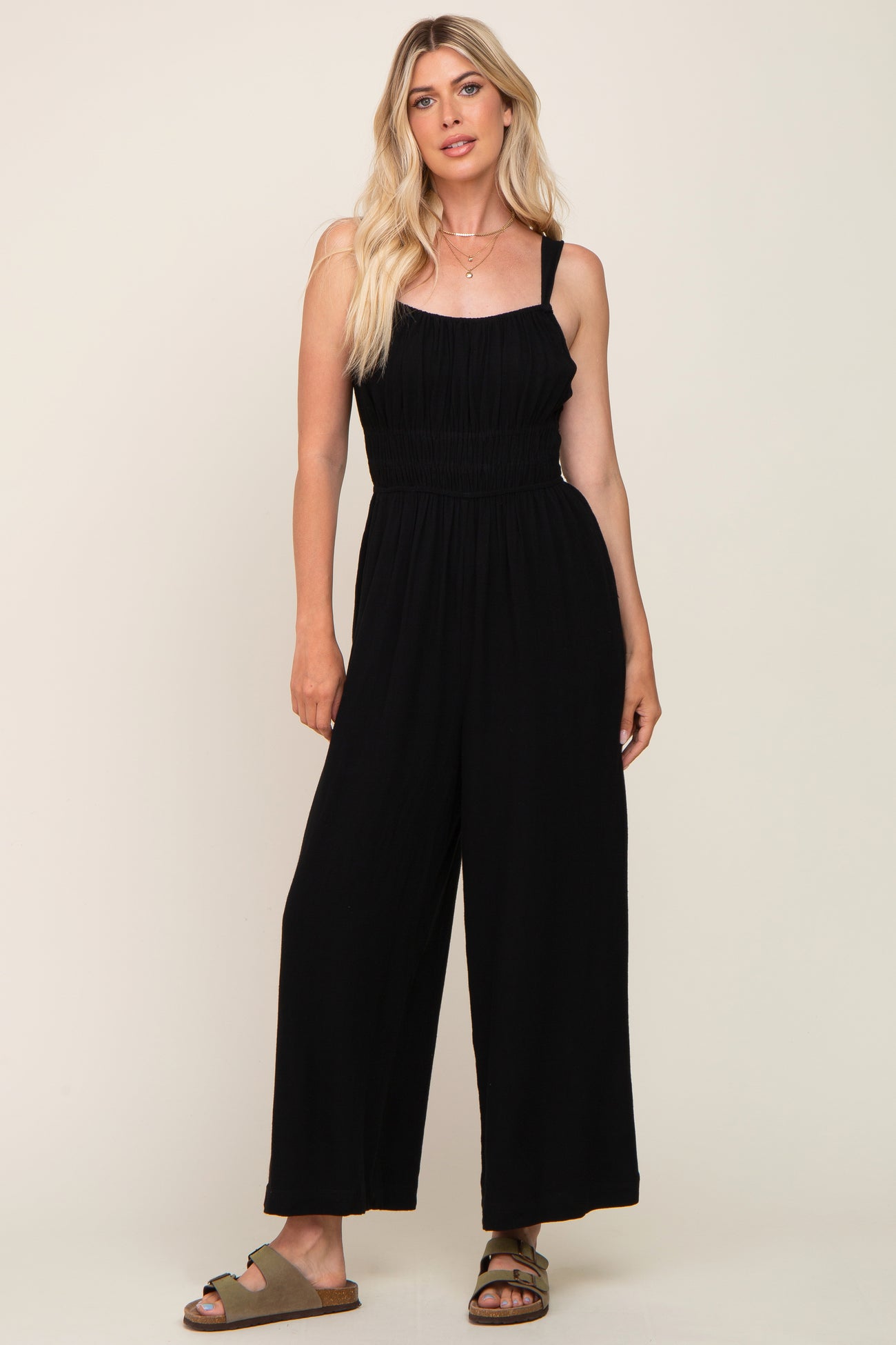 Black Smocked Square Neck Sleeveless Linen Jumpsuit