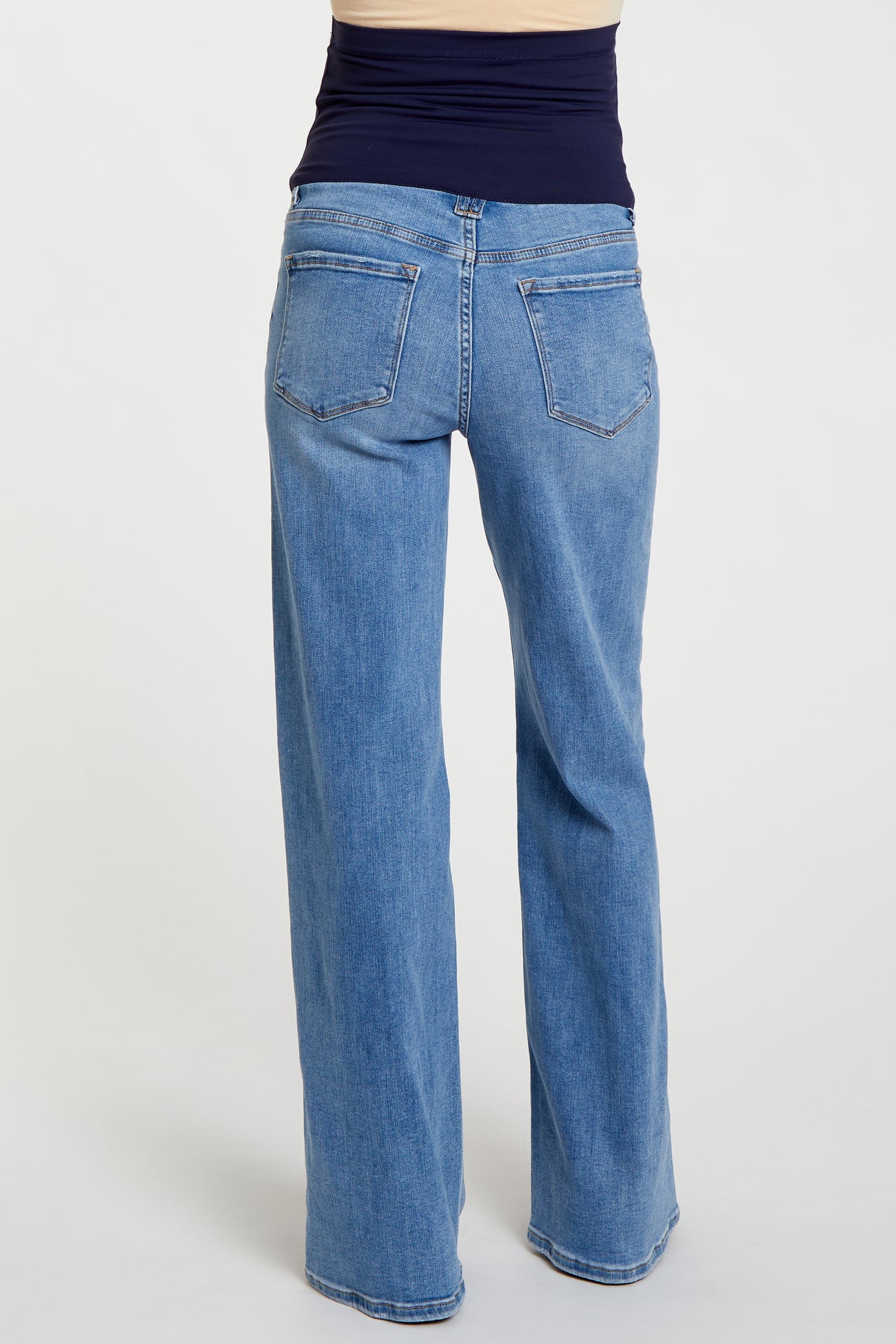 A medium wash pair of maternity jeans featuring 5 pockets, a wide hem and an elastic belly band.