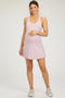 A French terry cloth maternity dress featuring a rounded neckline, cuffed short sleeves, side pockets, and a rounded hem.