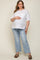 A pair of light wash maternity plus size jeans. Flared style with a full panel belly band, 5 pockets, and a distressed hem.