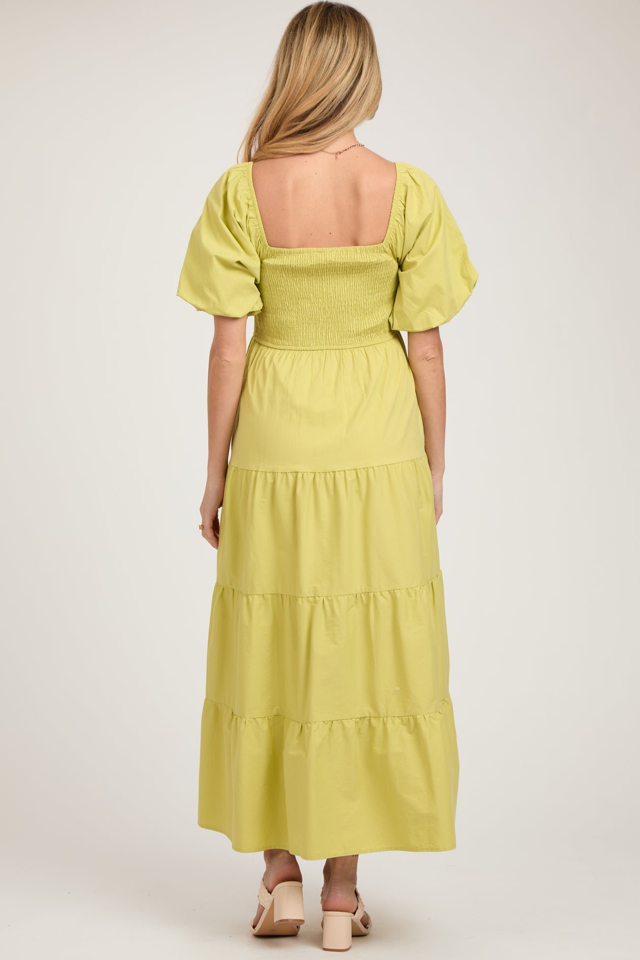 Light Olive Smocked Square Neck Puff Sleeve Tiered Maternity Maxi Dress
