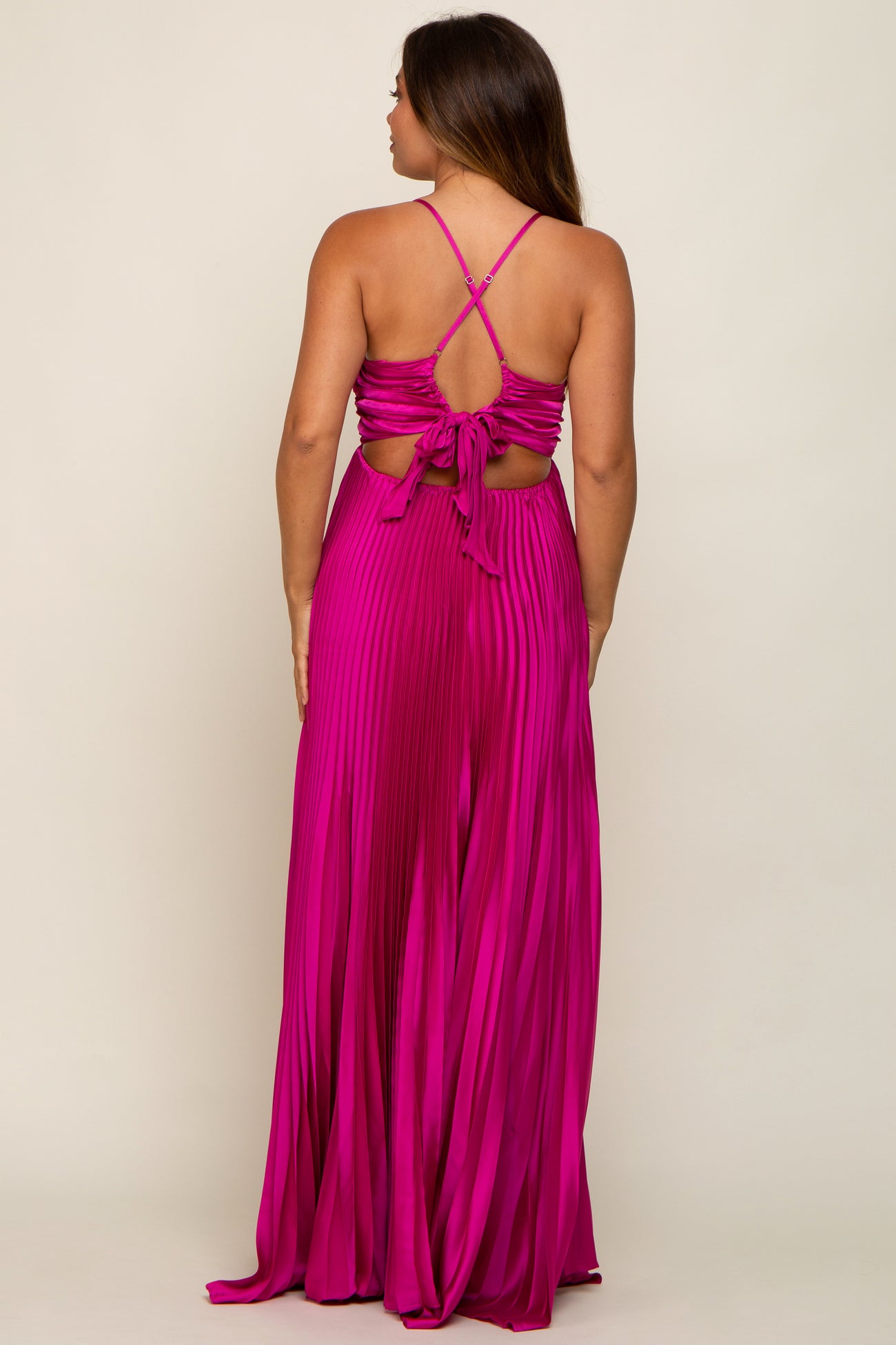 Details A solid maternity maxi gown in a satin pleated material. Features adjustable straps with crisscross design in back with cutout and tie detail. Content + Care