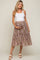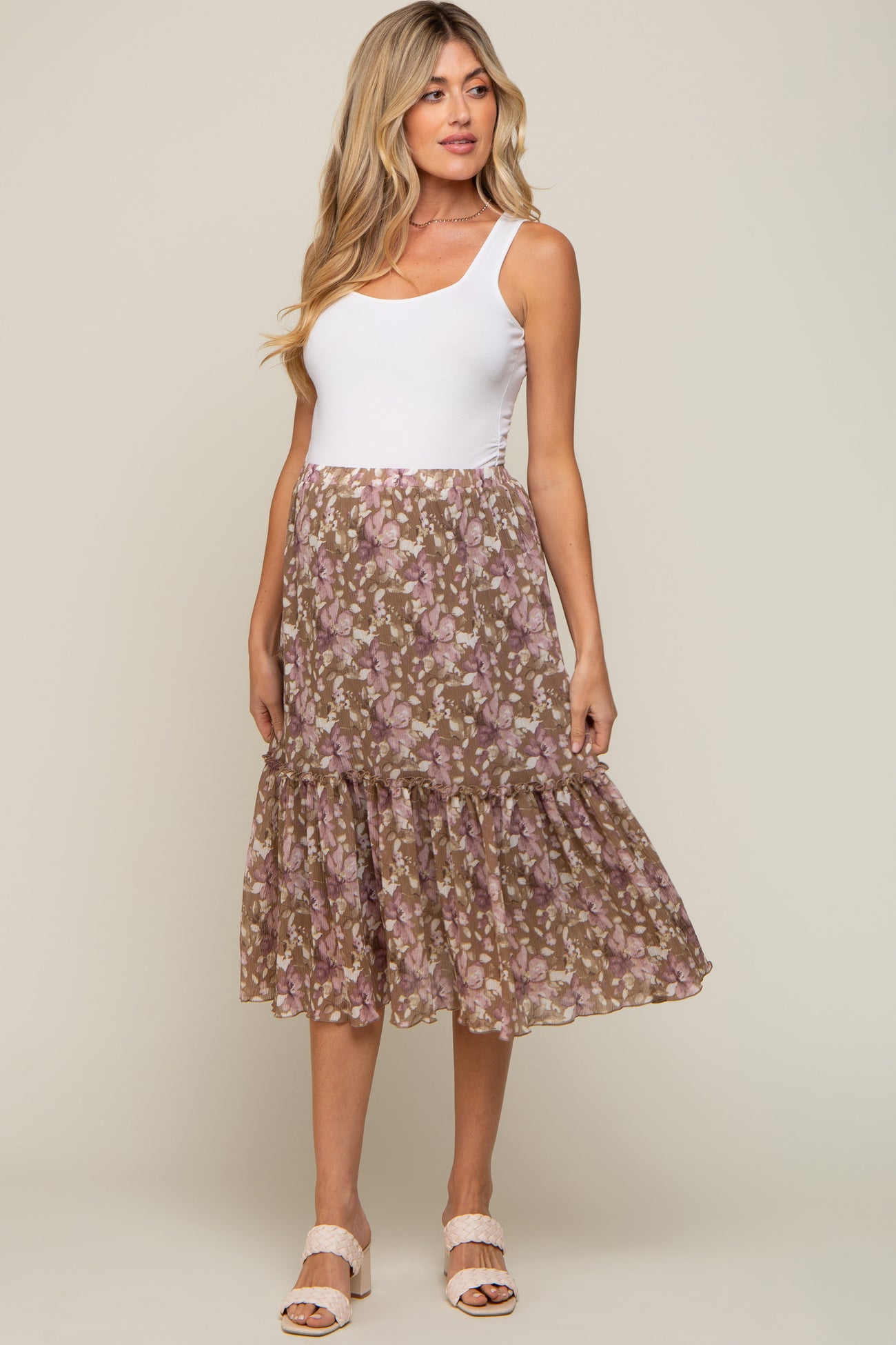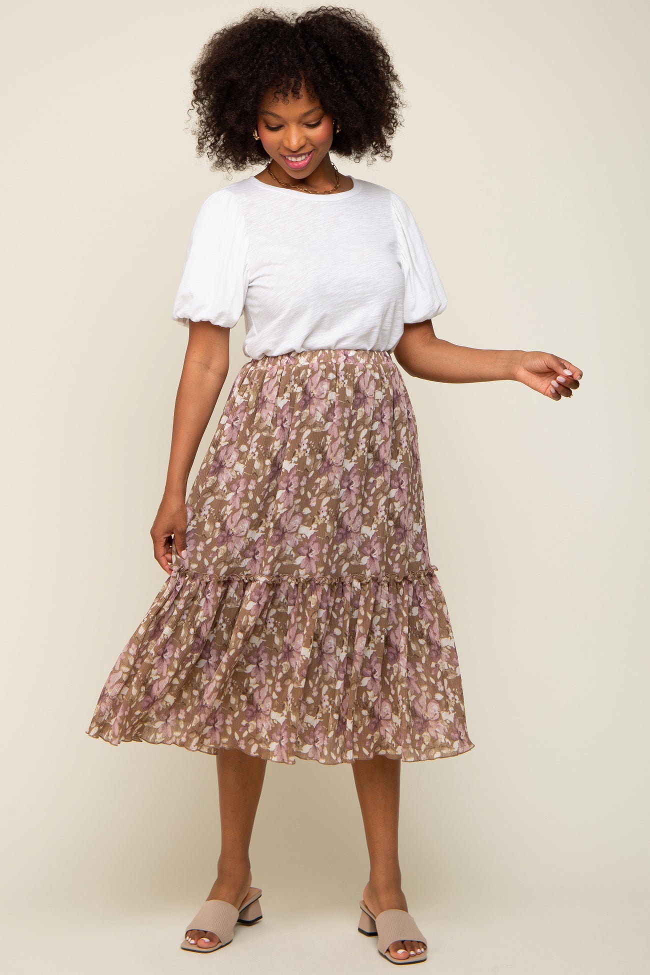 Mocha Floral Plisse Ruffle Accent Maternity Midi Skirt