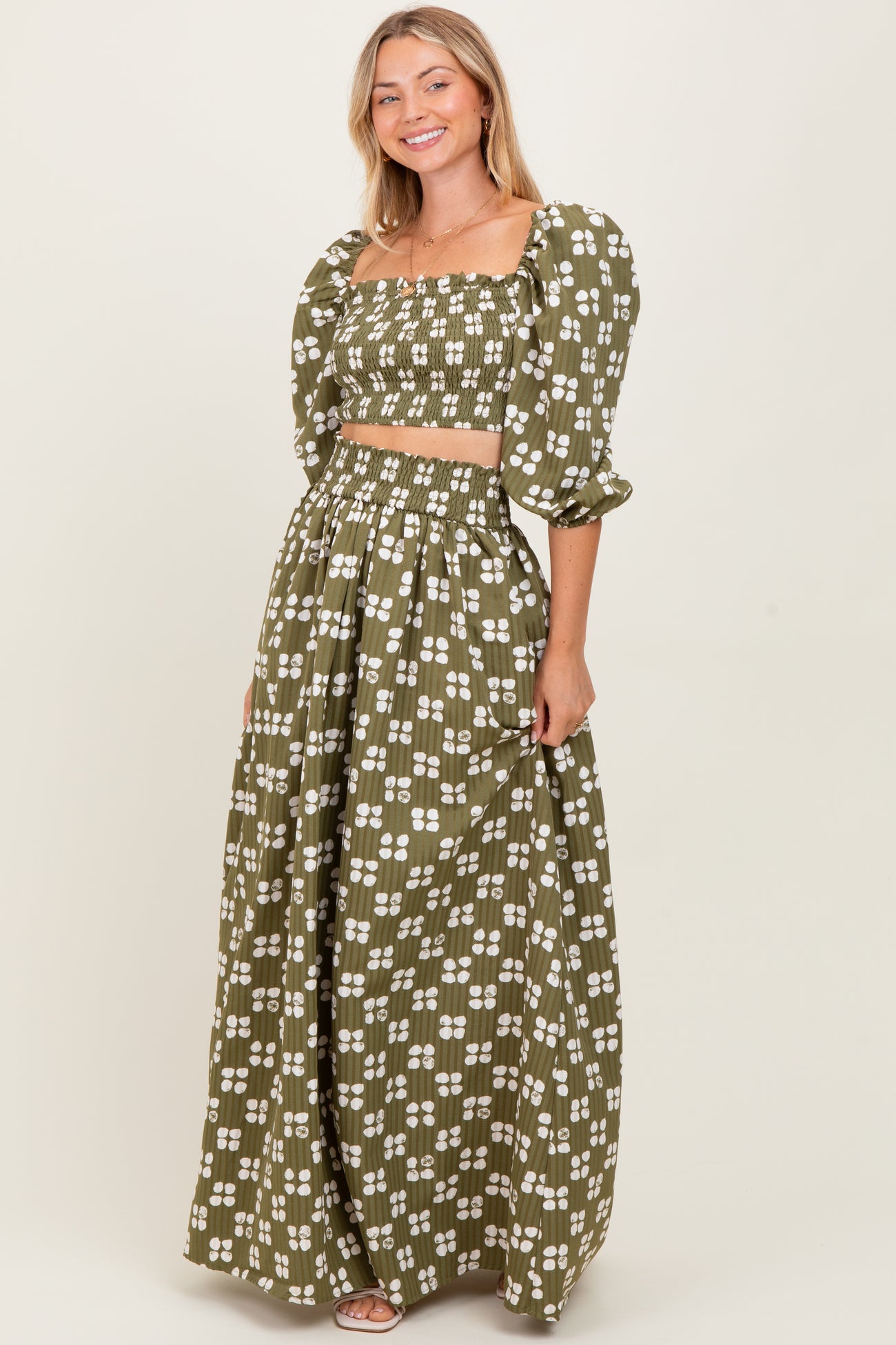 Olive Printed Smocked Crop Top Maxi Skirt Maternity Set