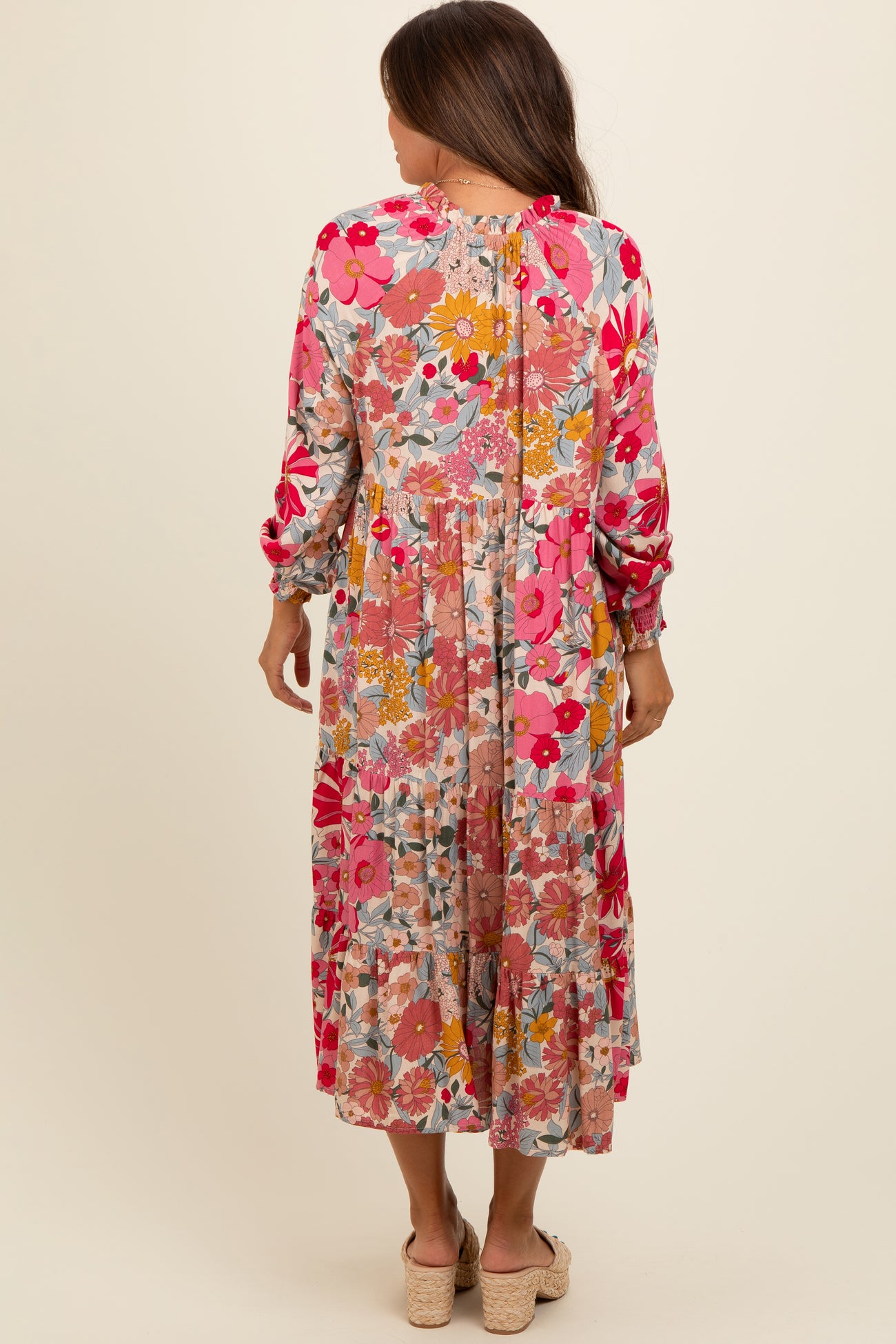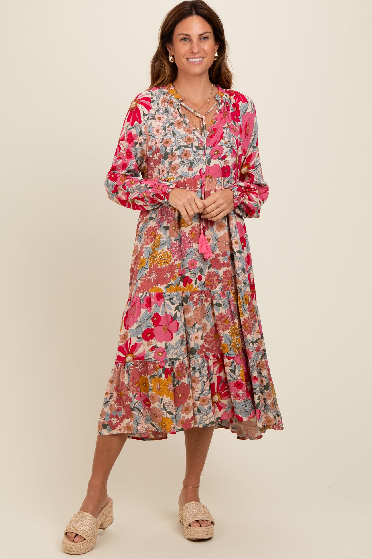 Pink Floral Tassel Tie Tiered Maternity Midi Dress