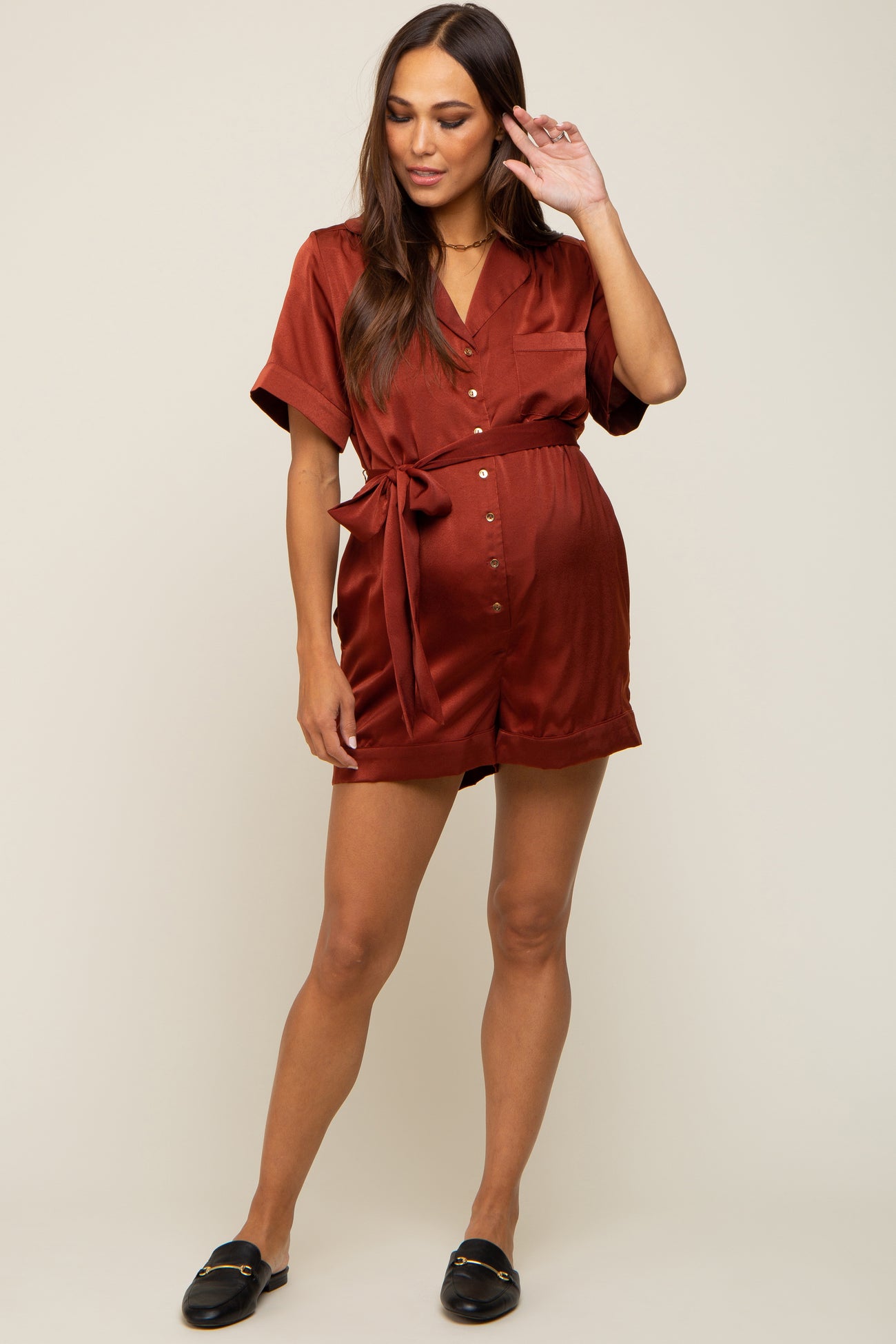 Details A solid satin maternity romper with a collared neckline, button down front, sash tie waist and cuffed shorts. Includes front pocket on chest and two side pockets. Content + Care