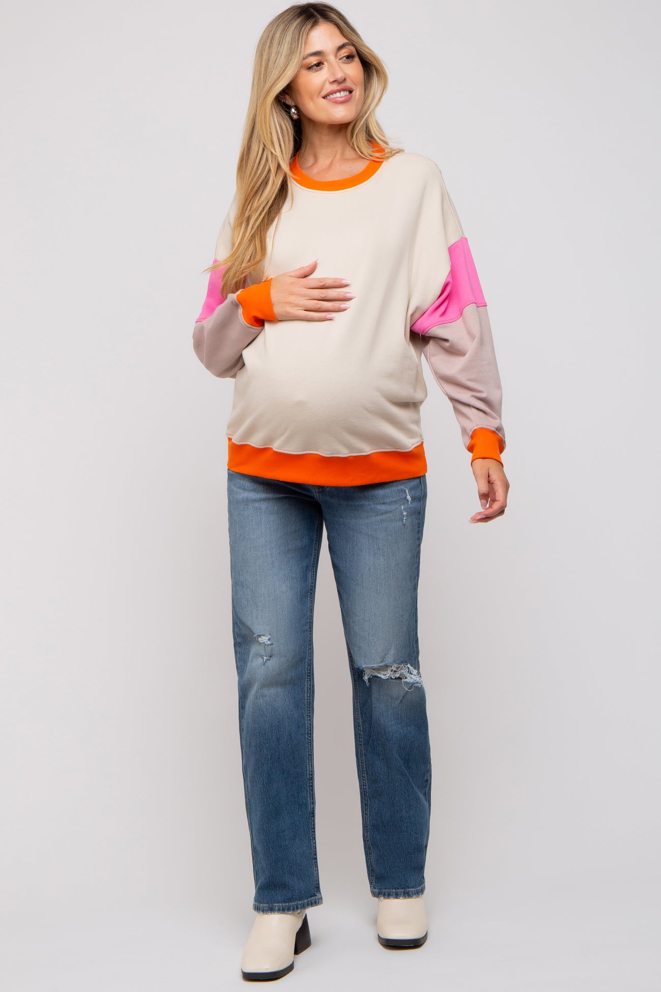 Details A color block maternity sweatshirt featuring a rounded neckline, long sleeves and ribbed trim. Content + Care