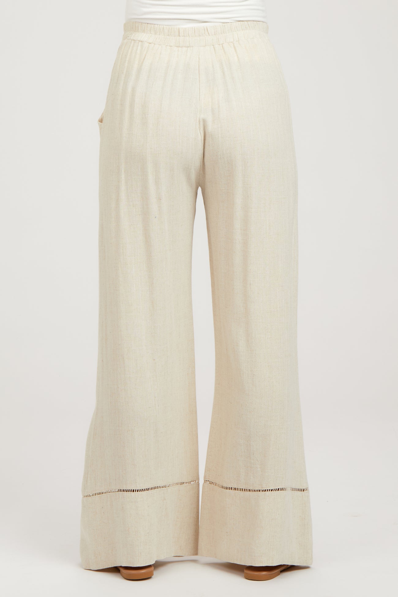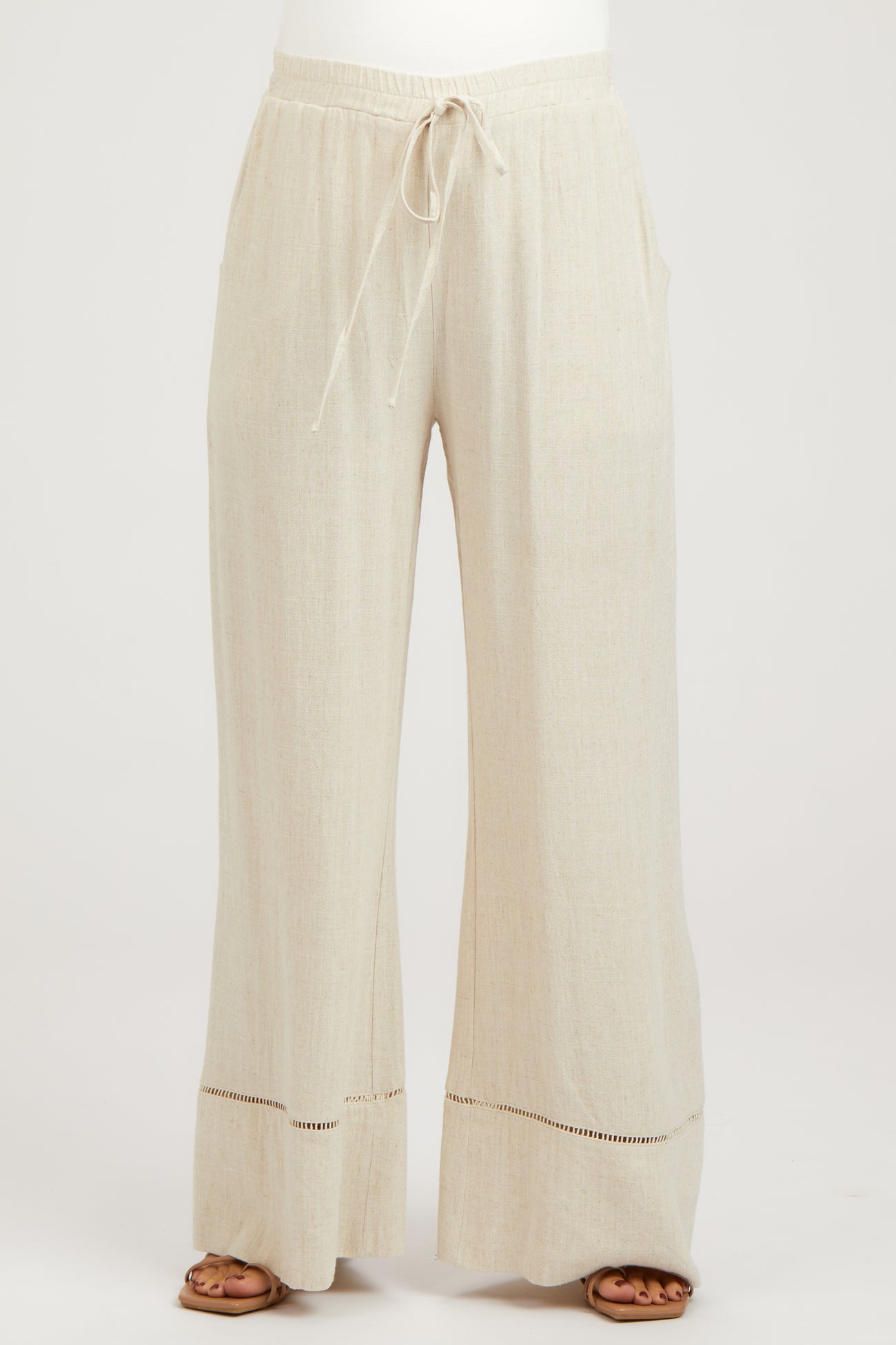 Beige Linen Wide Leg Lace Trim Maternity Pants