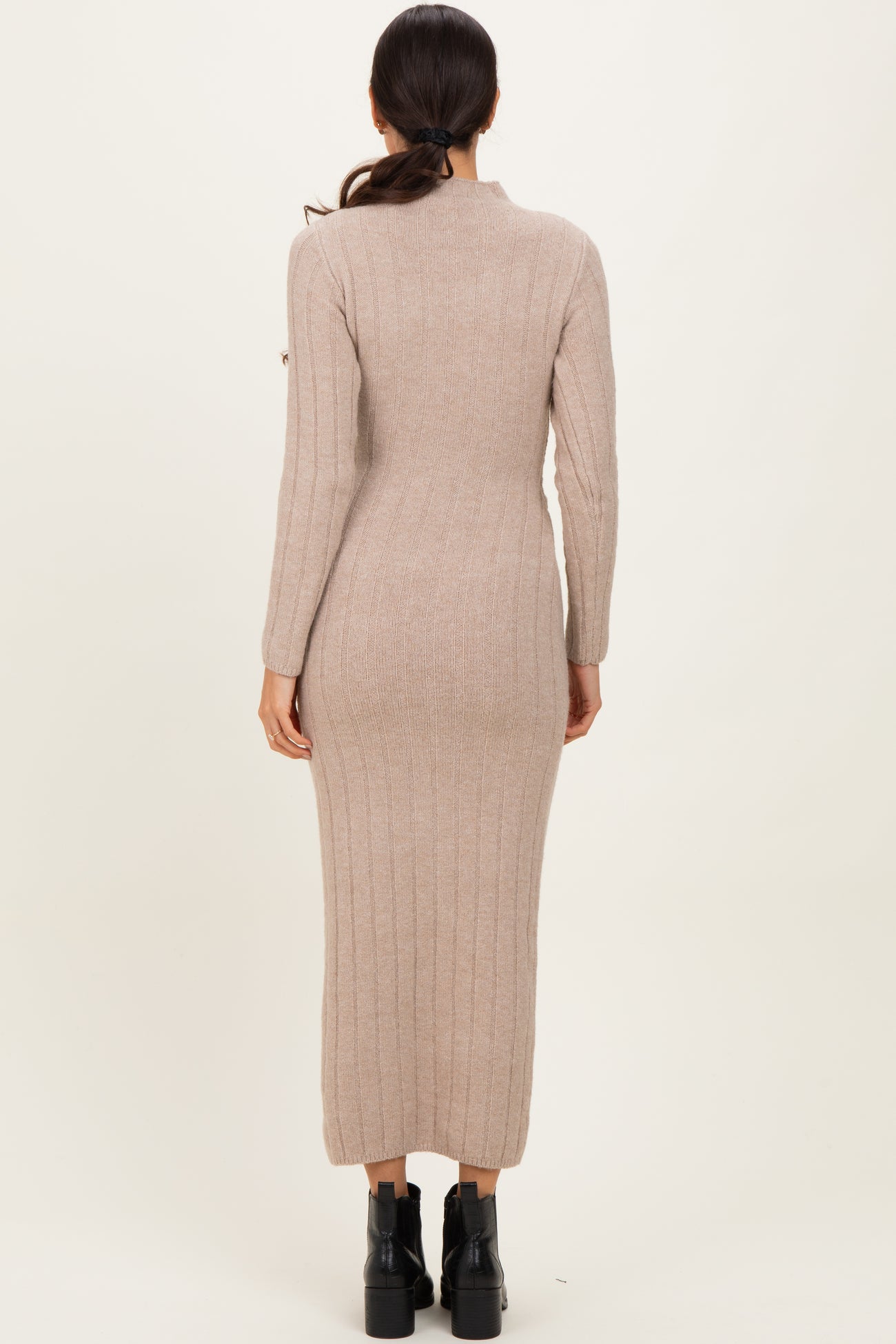 Beige Ribbed Front Tie Maxi Sweater Dress